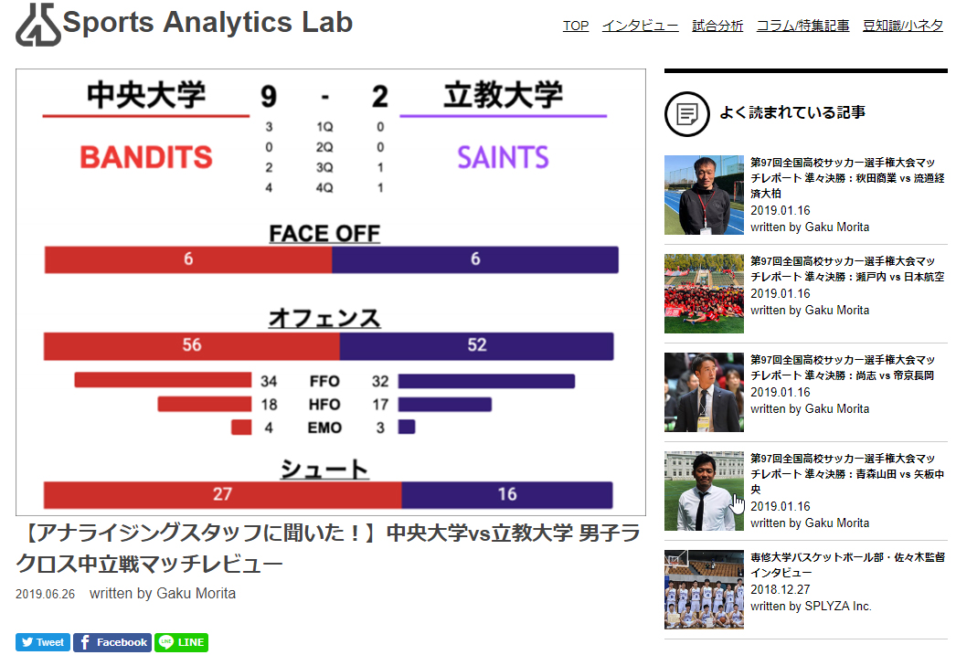 「Sports Analytics Lab」では、5/11(土)に行われた中央大学、立教大学の定期戦を、データレポートを踏まえ、数字の背景にどんな事があったのか?を両チームのアナライズスタッフにコメントしていただいた記事となってます。是非お読みください!