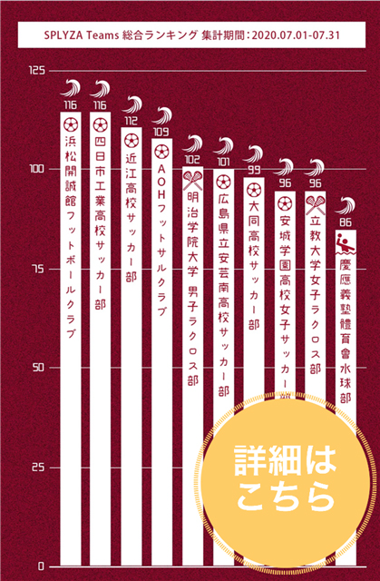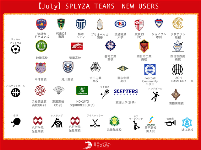 7月は、サッカー19・バスケットボール3・ラクロス1・ハンドボール1・卓球1・レスリング1アイスホッケー1・チアリディング1・吹奏楽1と、合計29チームが新しく仲間になりました!