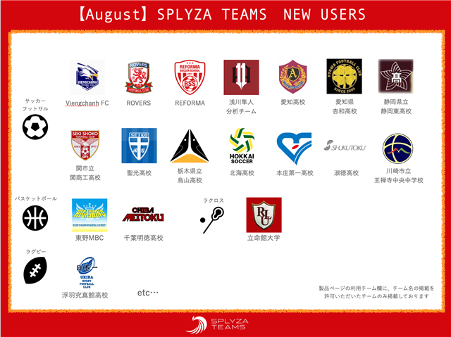 8月はサッカーやバスケット、ラクロス、ラグビーなど合計25チームが新たに仲間になりました!