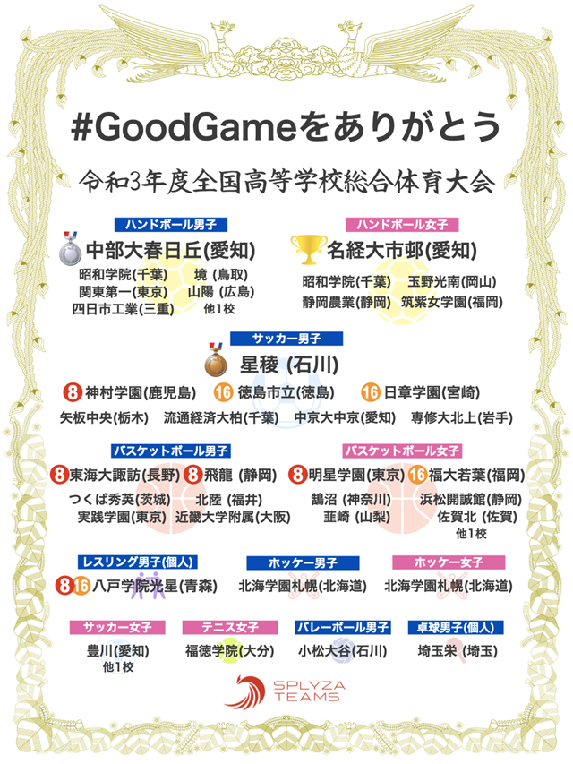 インターハイ2021において、SPLYZA Teamsをご利用いただいているチーム「全47校」が各競技で活躍しました!