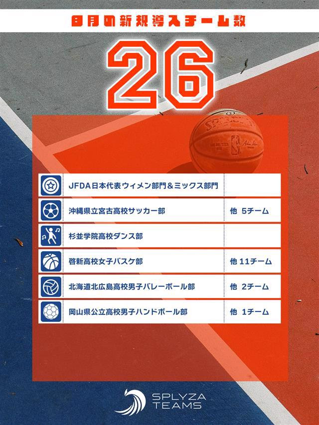 8月は26チームが新しくSPLYZA Teamsの仲間になりました。夏を終え、競技によっては新体制を迎えたチームもあるのではないでしょうか。次の大会に向けてSPLYZA Teamsを活用し共通理解を高めましょう!