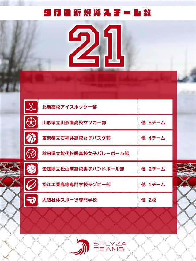 9月は21チームが新しくSPLYZA Teamsの仲間になりました。冬季の大会に向けて練習に精を出されているチームも多いと思いますが、SPLYZA Teams活用がチーム力アップの一助となれば幸いです!