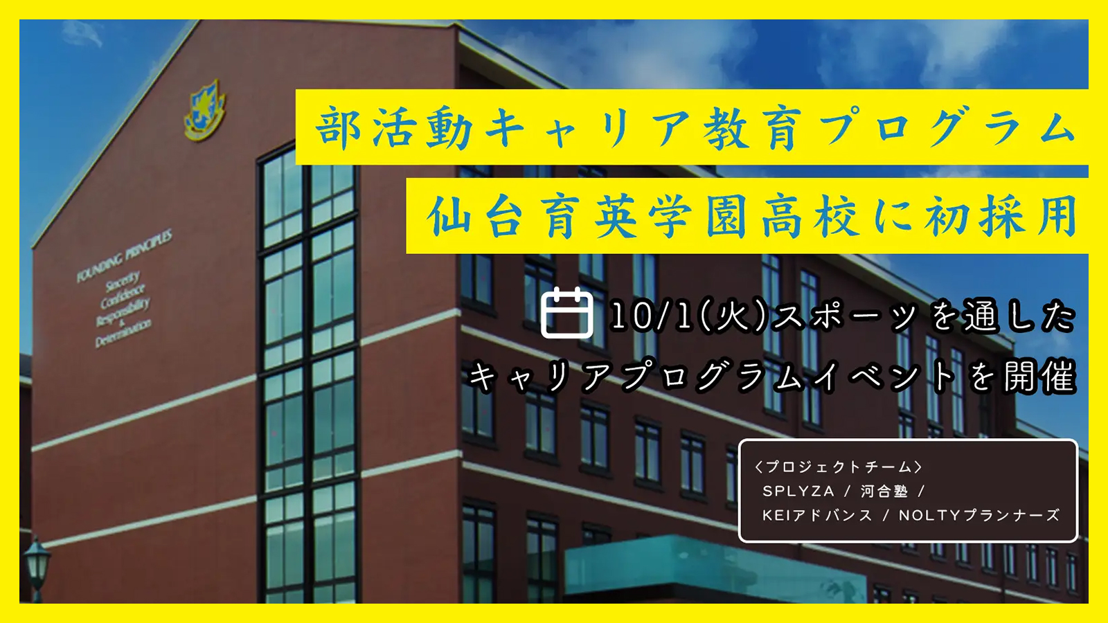 SPLYZA・河合塾・KEIアドバンス・NOLTYプランナーズの4社合同で行っているプロジェクト「部活動教育プログラム」が仙台育英学園高校に初採用いただきました。10/1には本プログラムの一環としてスポーツを通したキャリアプログラムイベント『SPLYZA DAY』を開催いたします。