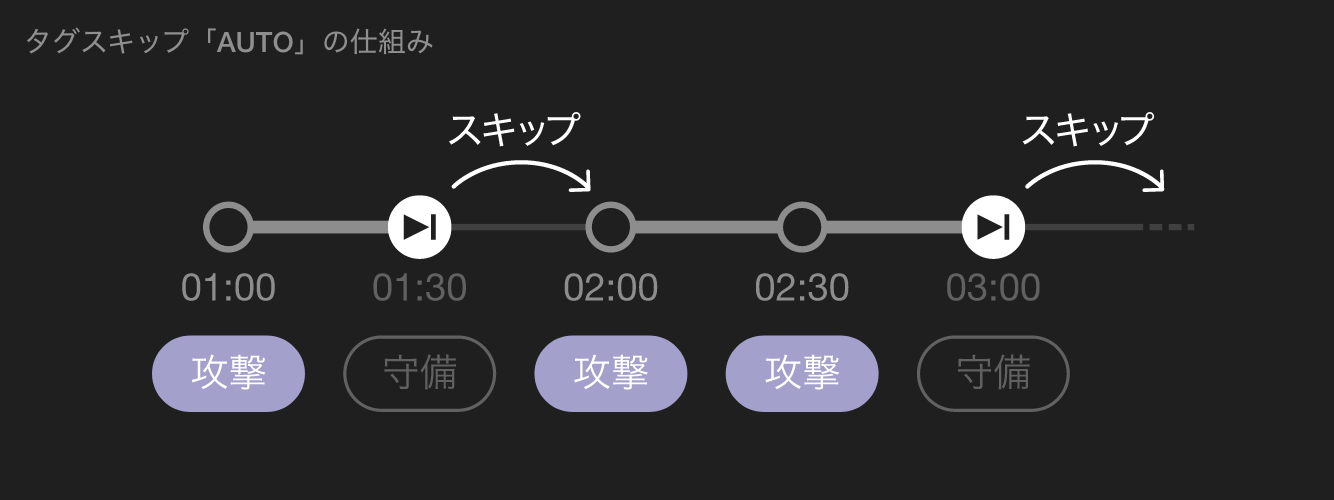 また、秒数指定ではなく「局面が切り替わる直前まで再生する」という使い方もできます。これがAUTOです。AUTOの仕組みは、選択中のタグと同じグループの他のタグをスキップします。